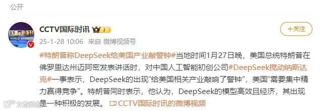 据@CCTV国际时讯 消息,当地时间1月27日晚,美国总统特朗普在佛罗里达州迈阿密发表讲话时,对中国人工智能初创公司DeepSeek搅动纳斯达克一事表示,DeepSeek的出现“给美国相关产业敲响了警钟”,美国“需要集中精力赢得竞争”。特朗普同时表示,他认为,DeepSeek的模型高效且经济,其出现是一种积极的发展。