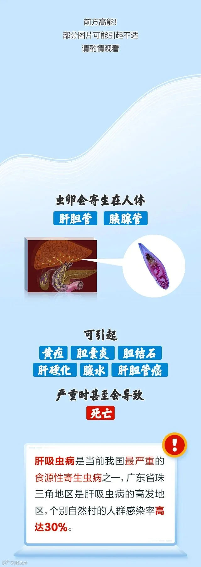 疾控专家提醒,生吃淡水鱼,肝吸虫囊蚴会进入人体,在肝胆管内寄生产卵并分泌有毒物质,从而引发一系列并发症。那么,肝吸虫到底是什么?通过哪些途径传播到人体身上呢?肝吸虫感染会有什么危害?一起来看——
