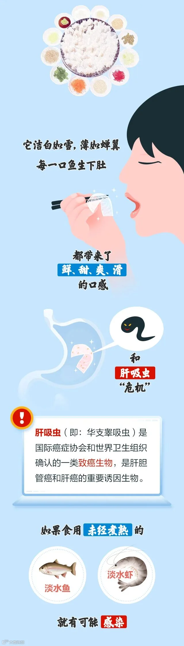 我国自古就有“病从口入”的说法,现代科学将它称为“食源性疾病”,这其中除了细菌病毒引起的跑肚拉稀,寄生虫病也是不容忽视的一类。夏天到了,爽口的淡水“鱼生”开始频繁出现在广东食客的餐桌上。