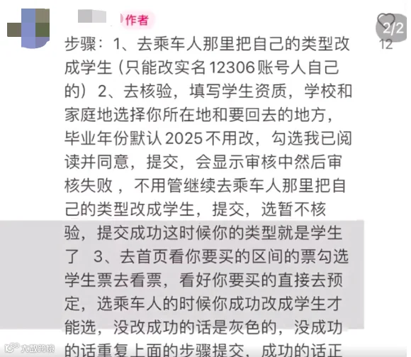 于是有网友在“学生票”上动起了歪脑筋,帖子内容显示,在12306购票软件上抢购春运车票时,可先以学生身份购票,且选择不核验学生资质,随后到站内补票为成人票,实现成功乘车。