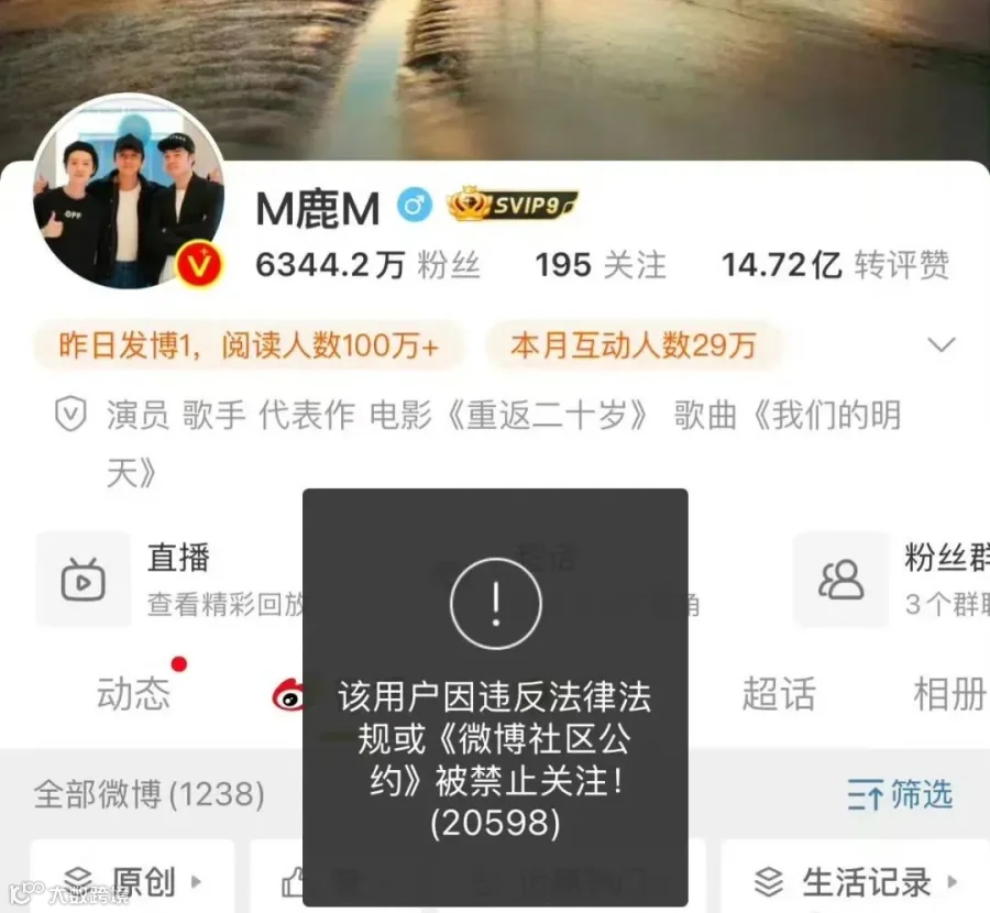 1月6日下午,有网友发现鹿晗多个社交账号均禁止被关注,随后相关话题迅速登上热搜。