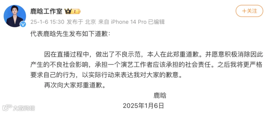 随后,@鹿晗工作室 代表鹿晗道歉回应此事: