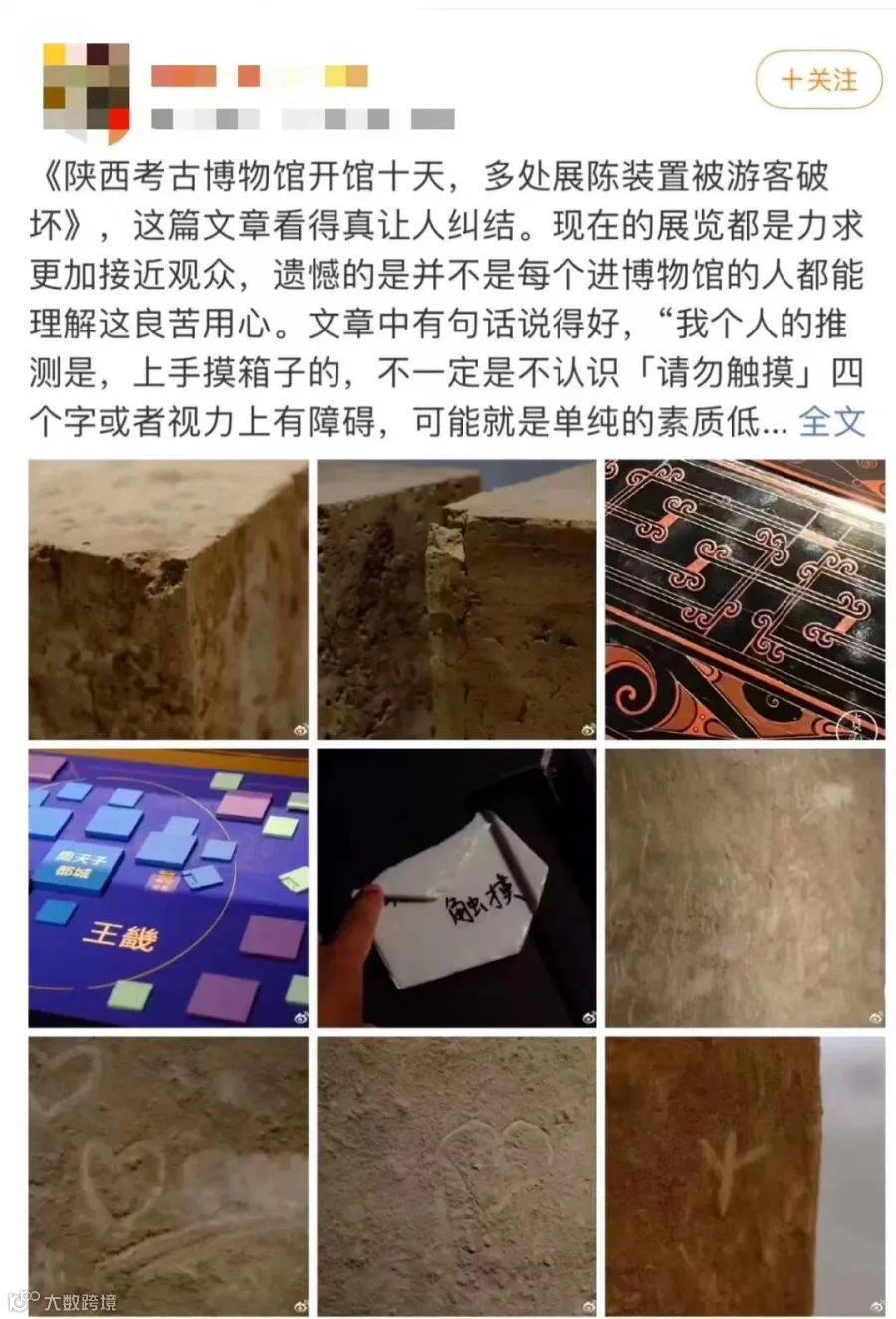 近日,有网友发文称,开馆仅10多天的陕西考古博物馆中,有多处展陈装置被游客破坏。