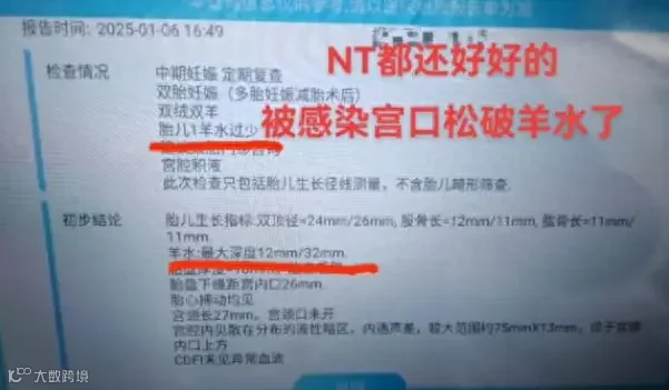 侯女士丈夫表示“NT(妊娠早期胎儿畸形的筛查指标)都还好好的,被感染宫口破羊水了。”“