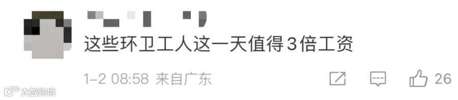如此大量的垃圾,后续会如何处理?1月2日早上6点,记者再次来到同一地点,并向清洁工了解到,平日里只需两名工作人员,今天会增加人手投入,而前一天由于是跨年夜,“早上更恐怖”,清洁工作需要赶时间,今早会全部扫在一起并用车直接拉走处理。