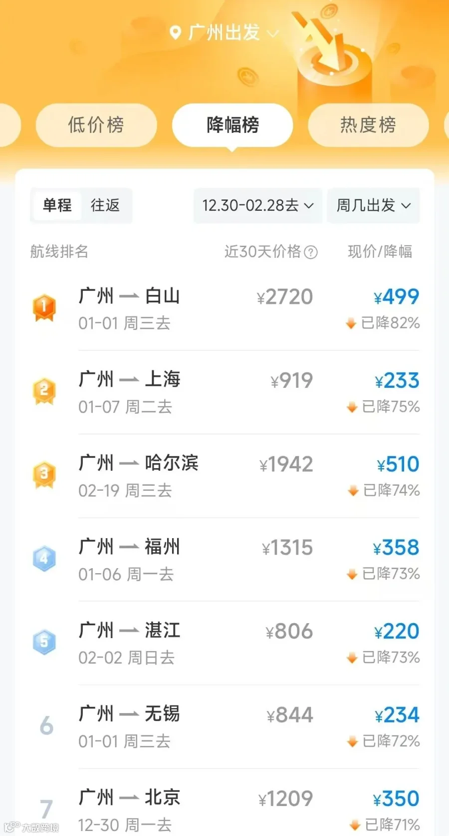 以广州出发的机票为例,到成都、上海、重庆、南京等热门城市最低价格从269元到335元不等。广州到上海下降75%;到哈尔滨下降74%;到北京下降71%。