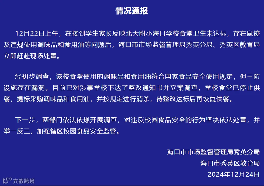 12月24日晚间,海口市市场监督管理局秀英分局和海口市秀英区教育局联合通报称,12月22日上午,在接到学生家长反映北大附小海口学校食堂卫生未达标,存在鼠迹及违规使用调味品和食用油等问题后,两部门立即赶赴现场处置。