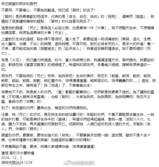琼瑶代表作有《窗外》《还珠格格》《烟雨濛濛》等。她的社交媒体更新了一则“遗书”,“我不想听天由命,不想慢慢枯萎凋零,我想为这最后的大事‘作主’。”