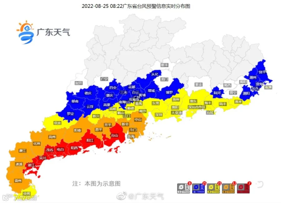 茂名市防汛防旱防风指挥部于8月24日16时启动防风Ⅱ级应急响应,经指挥部研究决定,自8月24日22时起,在全市范围内采取“五停”措施即:停课、停工、停产、停运、停业。除承担抢险救灾和保障社会基本运行任务的单位和个人外,其它人员切勿随意外出。各地开放避险避护场所供群众避风避险。