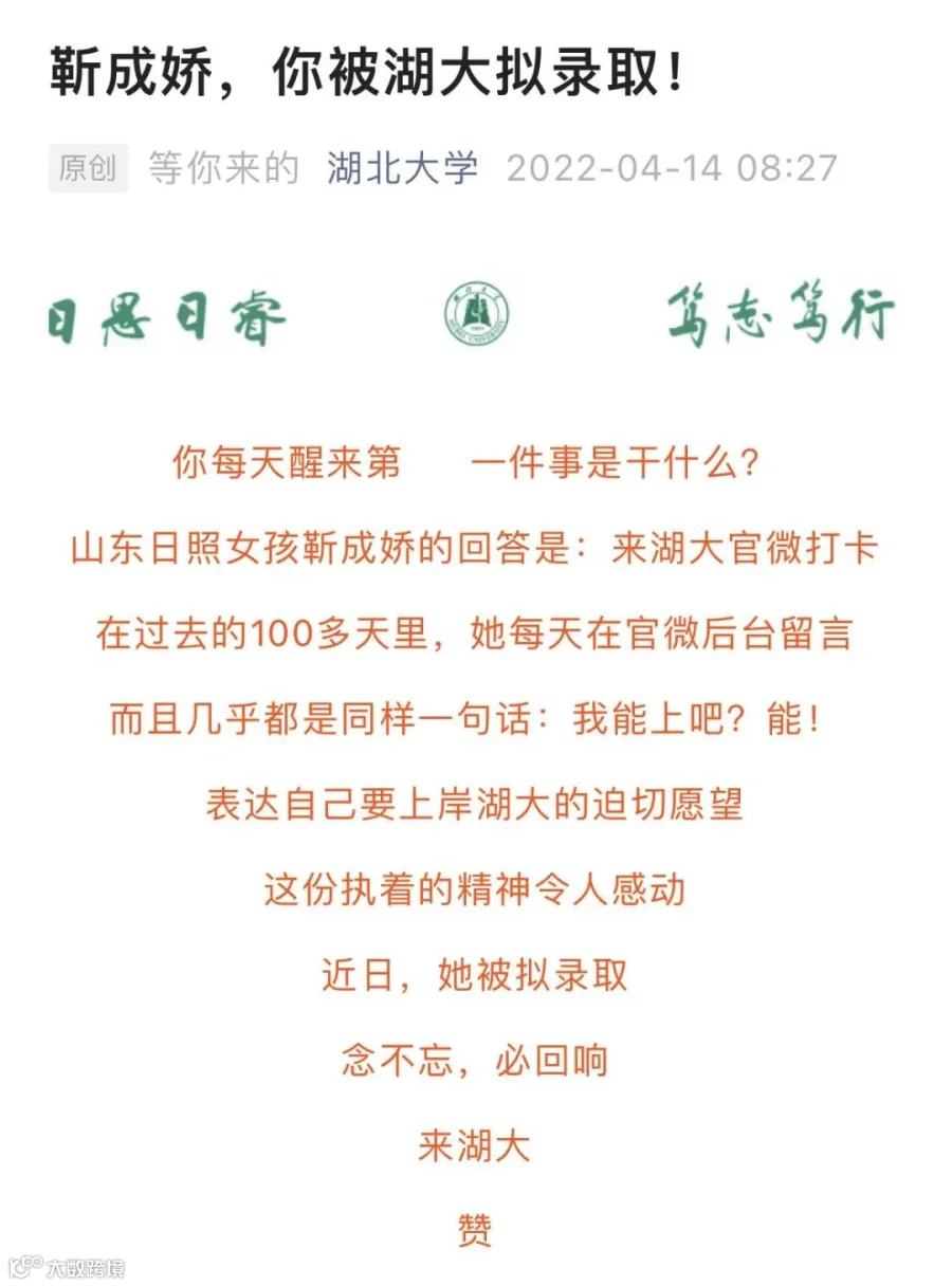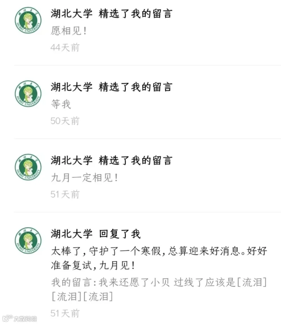 学校官微团队也很快注意到这个每天来留言的铁粉,真诚鼓励她。