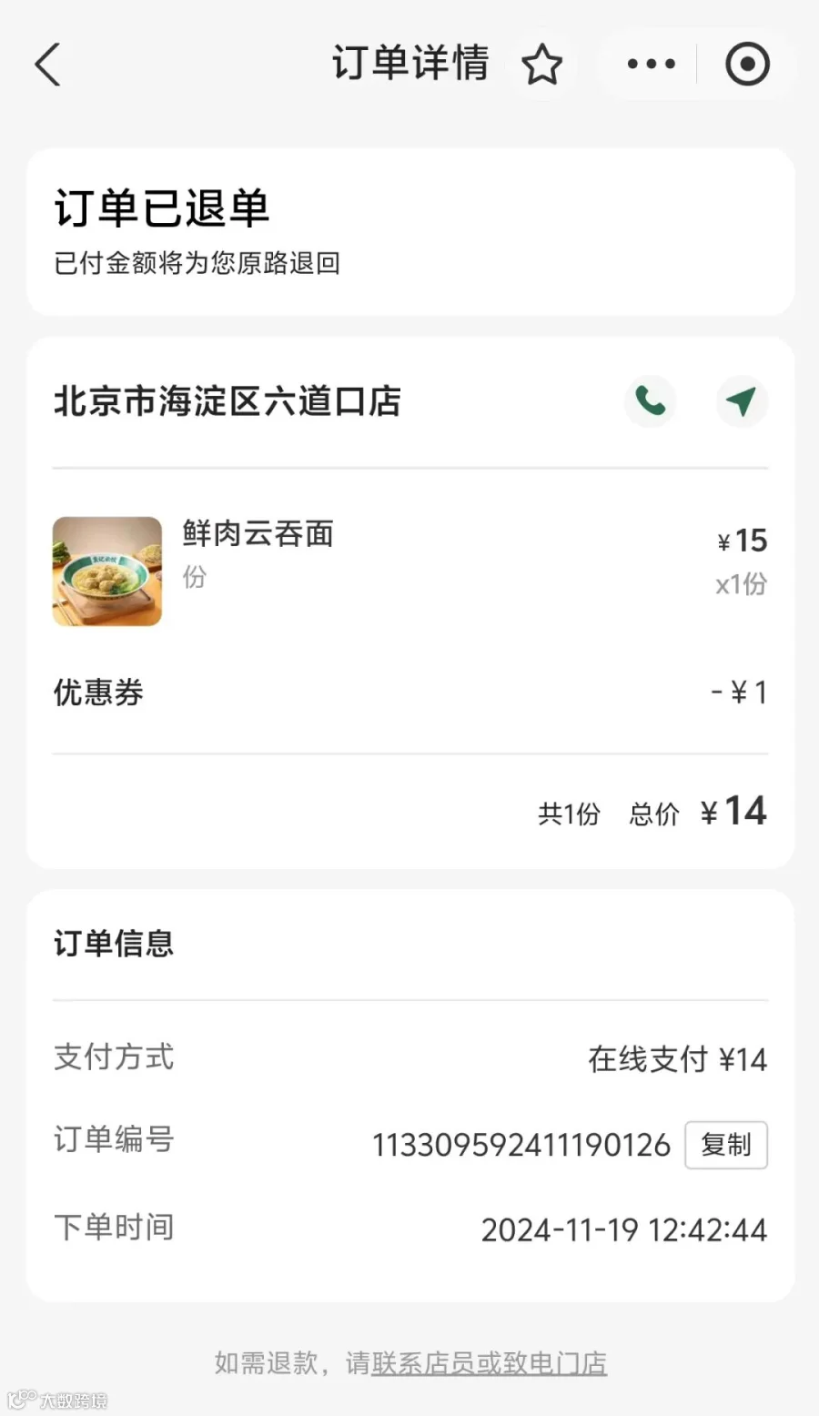 消费者说,在发现不明物体后,他随即将异物挑出并拍照向店家反映,商家主动提出退回餐费。消费者提供的转账截图显示,店家于当天退回餐费14元。