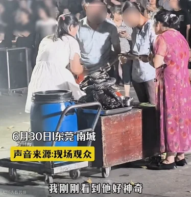 除了抓一些蛇表演外,表演者在现场还推广他们的产品,如挂在脖子上就可保平安的神奇链子,用多种珍贵药材和稀有动物研制的药酒,能止痒消肿,治痔疮牙痛。