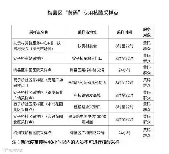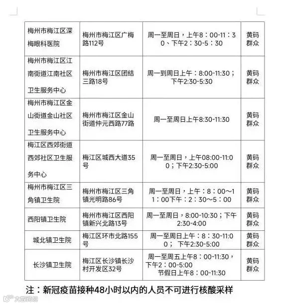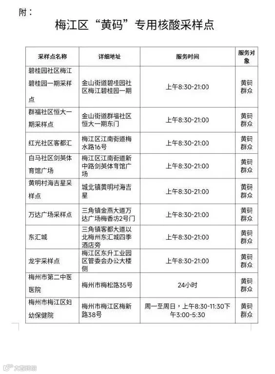 19日晚,梅州市卫健局发布温馨提示,梅州城区部分公共场所及二级以上医疗机构已开设“黄码”人员专用核酸采样点。