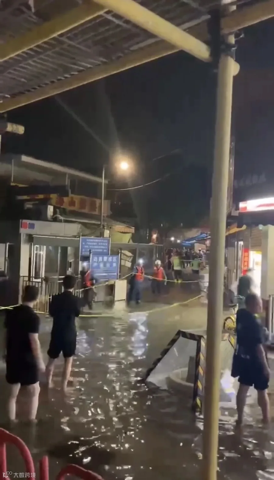 在网友发布的视频中可看到,一街区内部已发生水浸,水面漫过脚脖子,有身着应急服装的人员正在拉起警戒带。