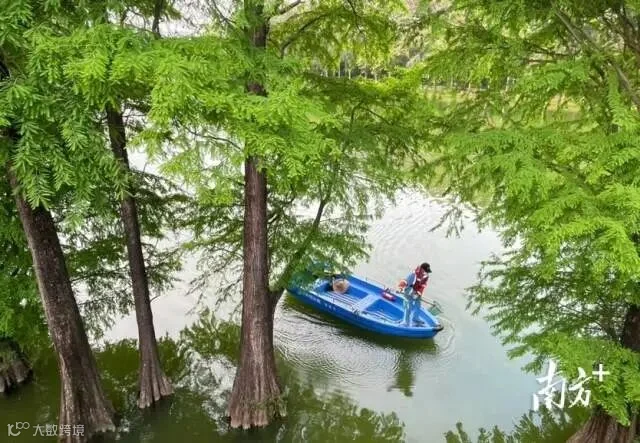 华南植物园里郁郁葱葱,园林“美容师”在杉树下清洁环境。小塘荷花 摄