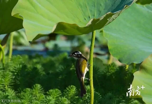 斗门华发湿地公园内绿意盎然,一只白头鹎在荷叶间逗留。小溪之花 摄