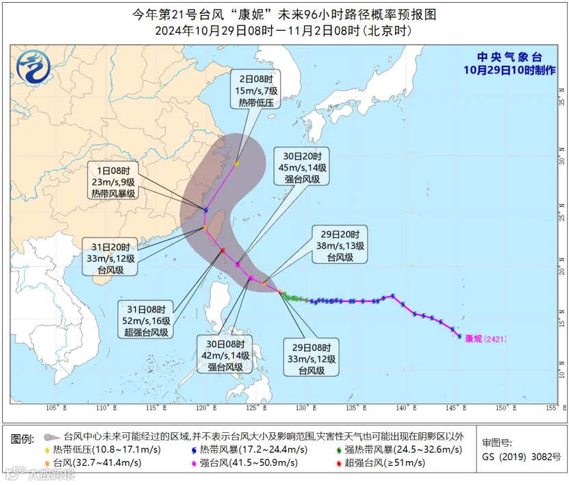 预计,“康妮”将以每小时15-20公里的速度向西北方向移动,强度逐渐增强,最强可达强台风级或超强台风级(48-55米/秒,15~16级),并将于31日中午到傍晚在台湾岛南部沿海登陆,随后穿过台湾岛进入台湾海峡,登陆或擦过福建沿海地区,随后转向偏东北方向。