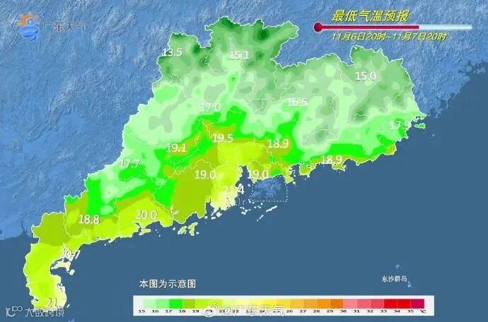 11月6日,大部晴到多云。最低气温:粤北市县14~17℃,南部沿海市县19~22℃,其余市县17~19℃。