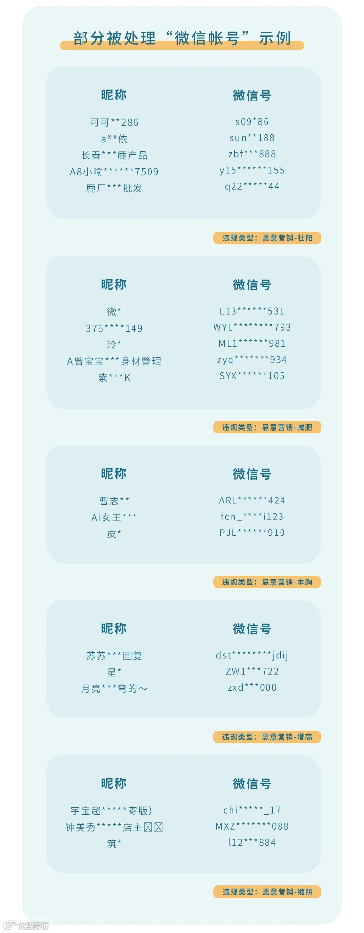 根据《网络安全法》《网络信息内容生态治理规定》等相关法律法规,以及《微信个人帐号使用规范》,微信对上述违规行为进行了专项治理。