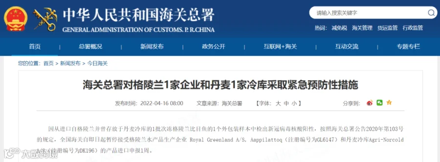 4月16日,海关总署官网发布消息称,因从进口自格陵兰并曾存放于丹麦冷库的1批次冻格陵兰比目鱼的1个外包装样本中检出新冠病毒核酸阳性,按照海关总署公告2020年第103号的规定,全国海关自即日起暂停接受格陵兰水产品生产企业 Royal Greenland A/S, Aappilattoq(注册编号为GL6147)和丹麦冷库Agri-Norcold A/S(注册编号为DK196)的产品进口申报1周。