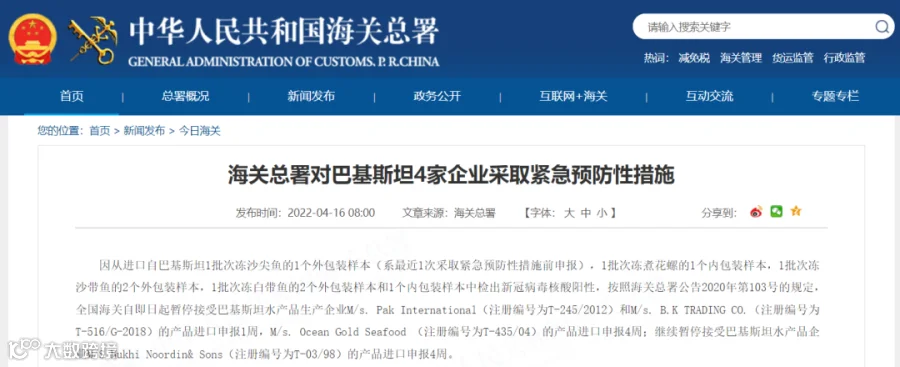 4月16日,海关总署官网发布消息称,因从进口自巴基斯坦1批次冻沙尖鱼的1个外包装样本(系最近1次采取紧急预防性措施前申报),1批次冻煮花螺的1个内包装样本,1批次冻沙带鱼的2个外包装样本,1批次冻白带鱼的2个外包装样本和1个内包装样本中检出新冠病毒核酸阳性,按照海关总署公告2020年第103号的规定,全国海关自即日起暂停接受巴基斯坦水产品生产企业M/s. Pak International(注册编号为T-245/2012)和M/s. B.K TRADING CO.(注册编号为T-516/G-2018)的产品进口申报1周,M/s. Ocean Gold Seafood (注册编号为T-435/04)的产品进口申报4周;继续暂停接受巴基斯坦水产品企业M/S Mukhi Noordin& Sons(注册编号为T-03/98)的产品进口申报4周。