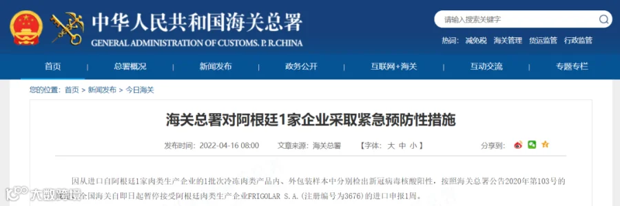 4月16日,海关总署官网发布消息称,因从进口自阿根廷1家肉类生产企业的1批次冷冻肉类产品内、外包装样本中分别检出新冠病毒核酸阳性,按照海关总署公告2020年第103号的规定,全国海关自即日起暂停接受阿根廷肉类生产企业FRIGOLAR S.A.(注册编号为3676)的进口申报1周。