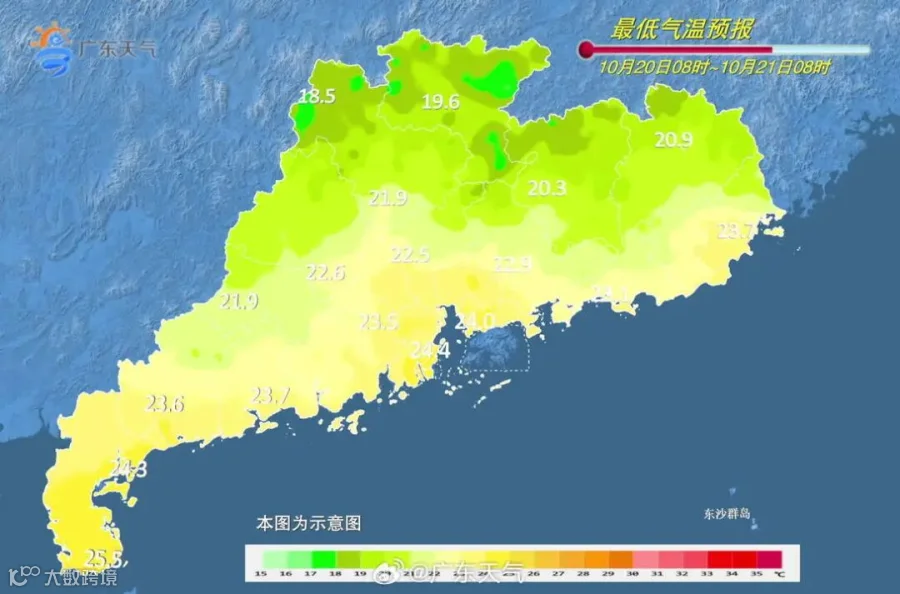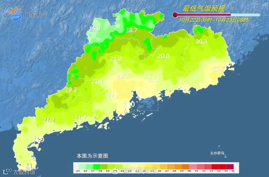 23日,全省晴间多云。最低气温:韶关和清远北部市县17~20℃,南部沿海市县23~25℃,其余市县20~23℃。