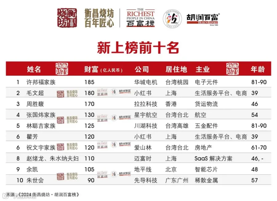 小红书的毛文超和瞿芳分别以180亿元和120亿元的财富上榜。