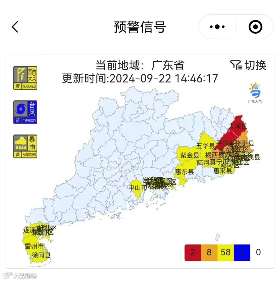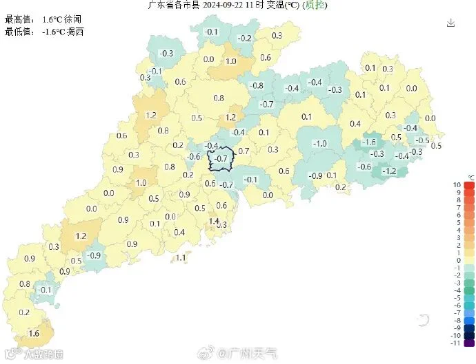22日,梅州南部、粤东市县雷阵雨转大到暴雨,局部大暴雨,雷州半岛多云,有中雷雨局部暴雨,其余市县多云到阴天,有(雷)阵雨。受冷空气南下影响,广东气温下降4~6℃,最高气温分布:北部市县25~28℃;中南部市县29~31℃。