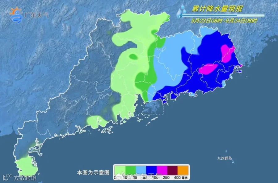 23-24日,粤东市县、梅州大部阴天,有暴雨到大暴雨,局部特大暴雨,河源、珠江三角洲东部市县阴天,有大雨到暴雨,其余市县多云到阴天,有阵雨局部大雨。最高气温:北部市县23~26℃,中南部市县27~29℃。