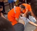 马上把孩子抱起来,一只手捏住孩子颧骨两侧,手臂贴着孩子的前胸,另一只手托住孩子后颈部,让其脸朝下,趴在救护人膝盖上。