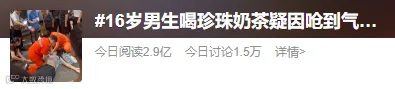 #16岁男生喝珍珠奶茶疑因呛到气管死亡#冲上热搜后引起网友关心讨论。