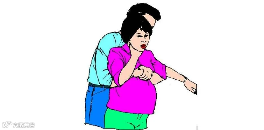 救护者站在受害者身后,从背后抱住其腹部,双臂围环其腰腹部,一手握拳,拳心向内按压于受害人的肚脐和肋骨之间的部位;