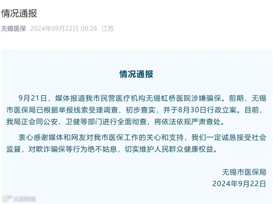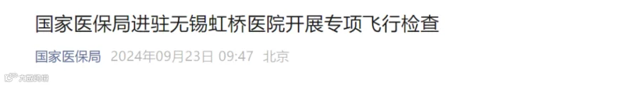 9月23日,国家医保局官方微信公众号发文称,针对近期网上举报的无锡虹桥医院涉嫌欺诈骗保问题,国家医保局派出飞行检查组,于今日上午进驻该院开展专项飞行检查。