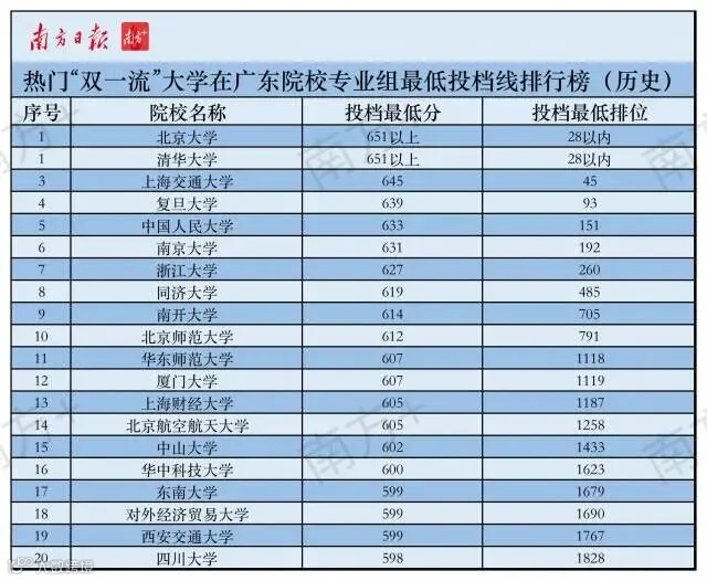 有观察人士指出,广东娃开始青睐省外“双一流”名校,促使专业组最低投档线、最低排位年年高攀。