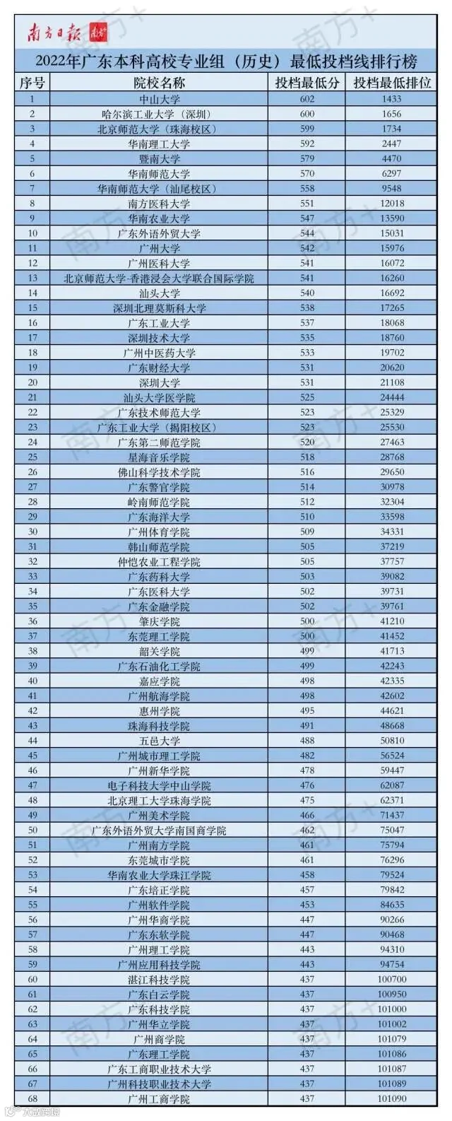 历史类投档中,中山大学、华南理工大学、暨南大学、华南师范大学、南方医科大学、华南农业大学、广东外语外贸大学、广州大学、广州医科大学、汕头大学闯入“十强”,广东工业大学、深圳技术大学、广州中医药大学、广东财经大学、深圳大学紧随其后。