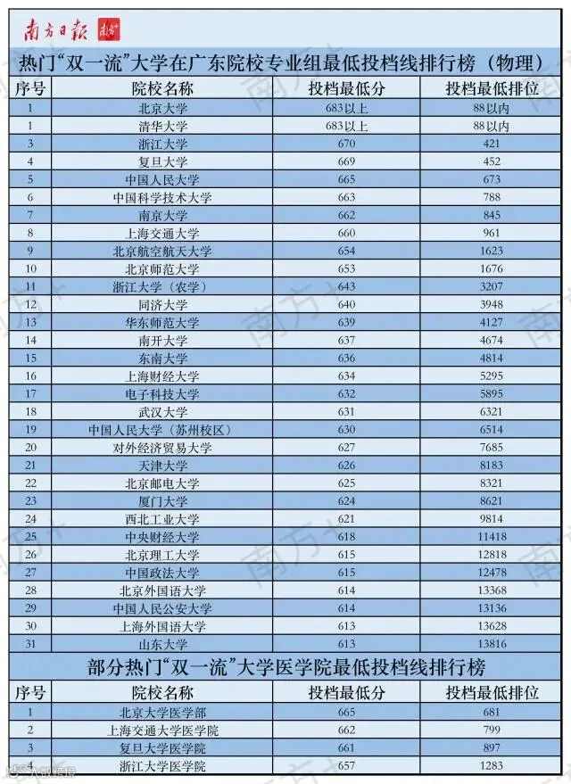 不过,有的“双一流”大学在广东录取的最低排位不高。比如,西安交通大学物理类最低投档线609分、最低排位15636名,与去年最低投档线644分、最低排位4294名相比发生较大变化;中南大学物理类最低投档线605分、最低排位18414名;中国地质大学(北京)物理类最低投档线587分、最低排位31882名。