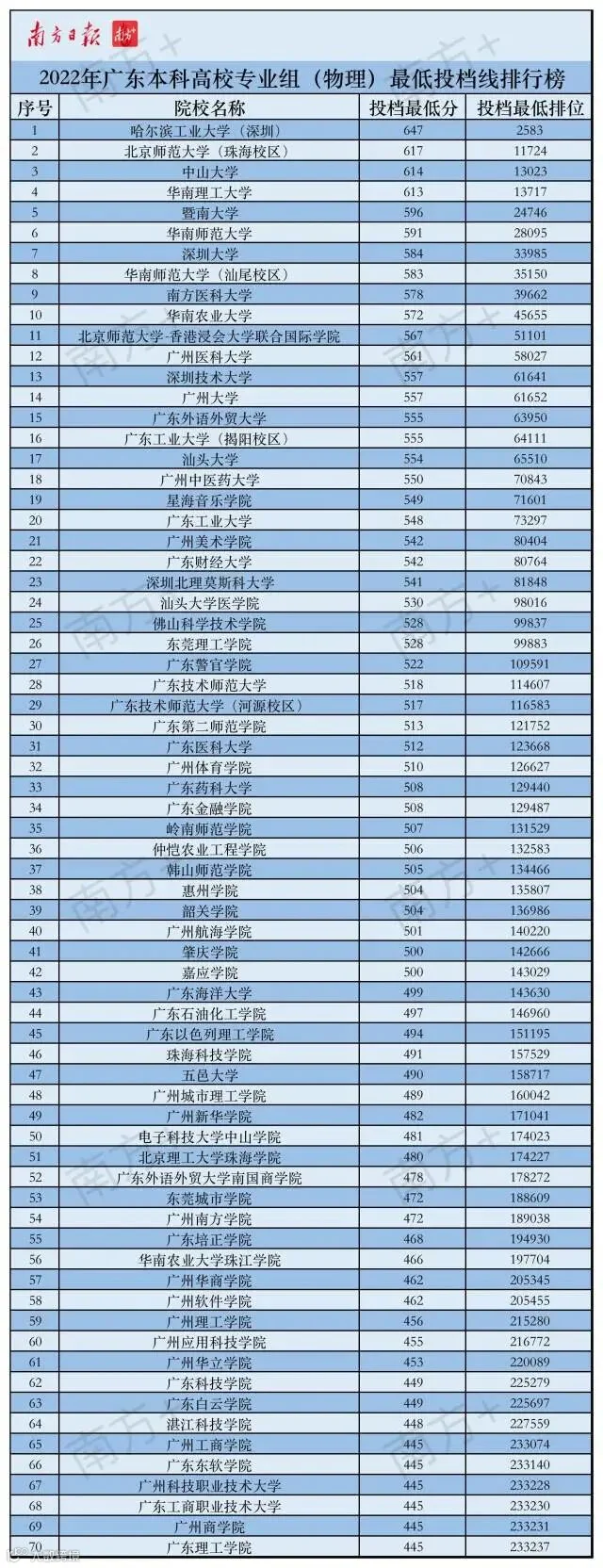 物理类投档中,中山大学、华南理工大学、暨南大学、华南师范大学、深圳大学、南方医科大学、华南农业大学、广州医科大学、广州大学、深圳技术大学闯入“十强”,广东外语外贸大学、汕头大学、广州中医药大学、星海音乐学院、广东工业大学你追我赶,这5所学校最低投档线仅相差7分。