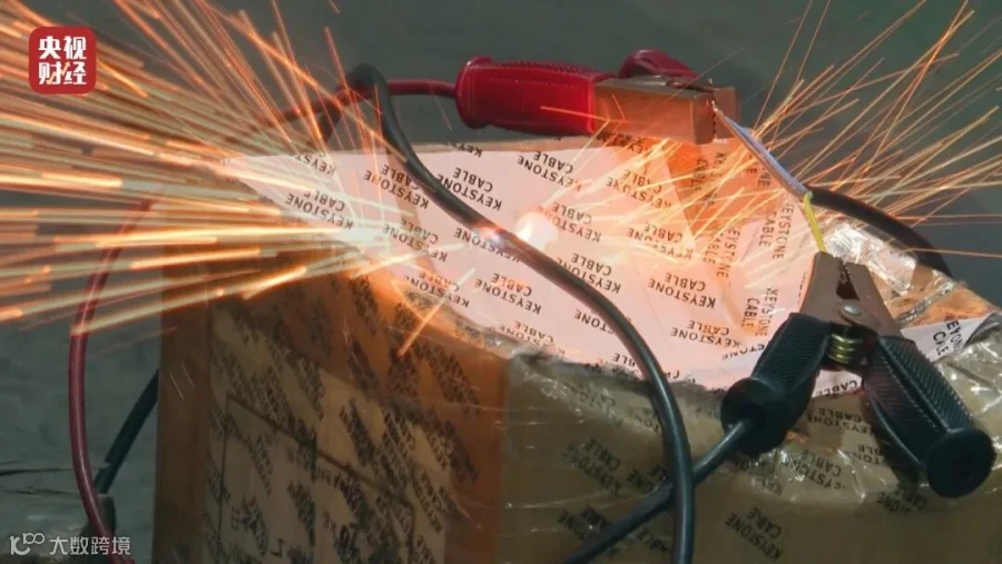 而当试验开始后,仅仅几秒钟,非标线缆就被击穿冒出了火花。