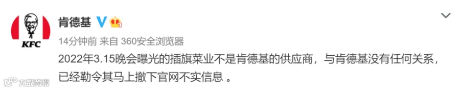 另外,昨晚22时,肯德基回应,插旗公司不是肯德基的供应商,与肯德基没有任何关系,正在联系插旗公司并勒令其马上撤下不实信息。目前插旗公司网站已无法正常打开。