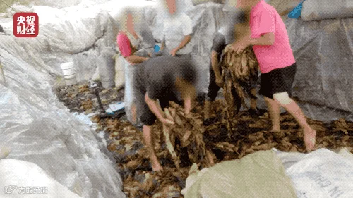 记者跟随公司的货车,在附近一片农田里,找到了腌制酸菜的土坑。工人们有的穿着拖鞋,有的光着脚,踩在酸菜上,有的甚至一边抽烟一边干活,抽完的烟头直接扔到酸菜上。而这些酸菜在被插旗菜叶收购时,