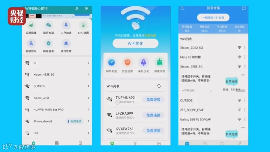 工程师进一步测试发现,这类免费WiFi的应用程序还在后台大量收集用户信息。比如,一款叫“雷达WiFi”的应用程序,一天之内收集测试手机的位置信息,竟然高达67899次。