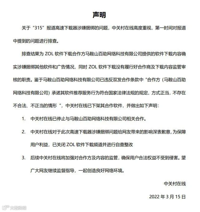 昨晚接近12时,中关村在线微博对“315”报道中高速下载器涉嫌捆绑的问题发布了声明。