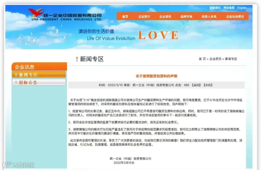 统一(中国)投资有限公司当晚在官网发布声明回应称