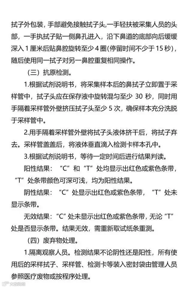 (一)需满足的主要条件。隔离观察人员进行抗原检测需同时满足以下条件:1.建立抗原自测管理流程,包括抗原检测试剂领取、人员信息核对、检测过程监督、结果上报等。2.隔离观察人员需认真阅读说明书,按照规定的要求和流程,规范地进行采样、加样、结果判读等操作;有条件的管理部门要对检测过程进行监督管理,确保检测结果真实可信。3.做好废弃物处理。检测使用后的采样拭子、采样管、检测卡等,不论结果阴性还是阳性,均装入密封袋由管理人员参照医疗废物或按程序处理。