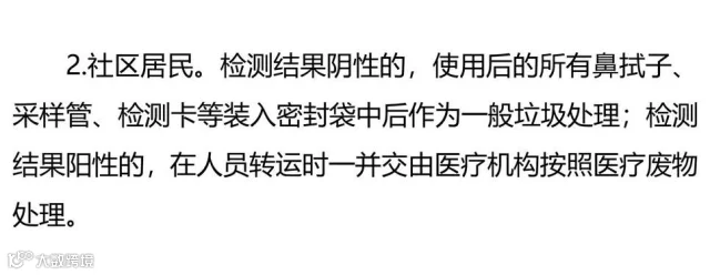 2.针对抗原检测阴性人员,基层医疗卫生机构应当予以对症治疗、嘱其居家观察,自就诊当日起连续5天每天进行一次抗原检测,避免社交活动,正确佩戴口罩,勤洗手勤通风。抗原结果一直阴性、直至症状消失的,可不采取其他干预措施。抗原结果一旦阳性,阳性人员需立即向所在社区(村镇)报告,由社区(村镇)联系急救中心按照新冠肺炎疫情相关人员转运工作指南,将其转运至设置发热门诊的医疗机构,进行核酸检测;阳性人员使用后的采样拭子、采样管、检测卡等装入密封袋一并转运至医疗机构作为医疗废物处置。