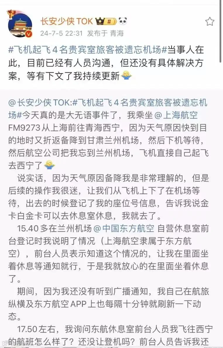 “7月4日您搭乘的东航旗下上海航空有限公司FM9273 上海浦东——西宁航班因天气原因备降兰州机场。航班备降后,我公司机组人员和地面工作人员严格按照安全和服务程序组织旅客下机休息,并进行了安全清舱检查。再次组织登机过程中,因地面工作人员疏忽,未及时通知在贵宾休息室的旅客,导致您漏乘该航班。虽然后续有安排包车等措施,但依然让您的本次行程体验不佳。我们将吸取教训,改进服务工作,并请您继续监督,提出宝贵的意见和建议。”
