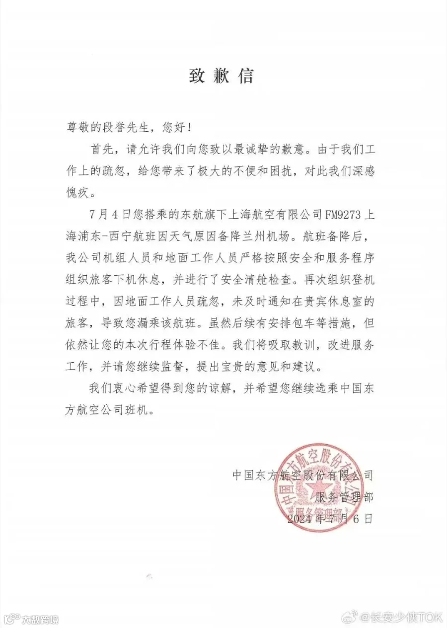 同时,该博主附上了一张落款为中国东方航空股份有限公司(以下简称“东航”)的致歉信。东航在信中表示: