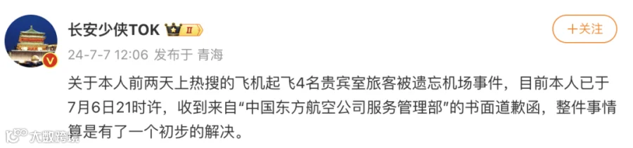 7月6日,记者联系到博主@长安少侠TOK段先生了解事情进展。他表示,目前东航总部和东航甘肃分公司已介入此事,东航方约定于7月6日晚与其沟通解释。