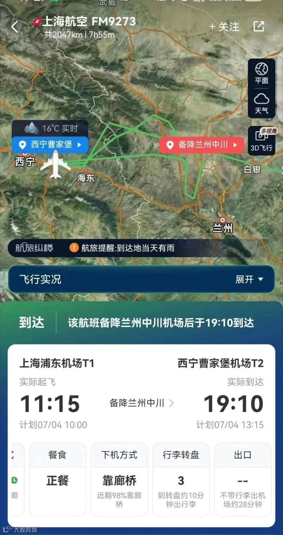 7月4日的FM9273航班因为天气原因,于14:42备降兰州。